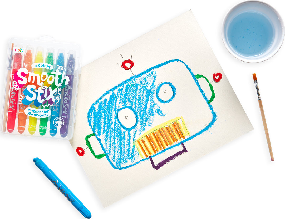¿Qué es suave y colorido? ¡Los ceras de gel de acuarela Smooth Stix de OOLY sí lo son! Deja que los colores se deslicen con trazos sencillos y usa el pincel y el agua incluidos para añadir efectos increíbles de acuarela. Este set de 6 ceras de gel no se seca y además se pueden lavar.