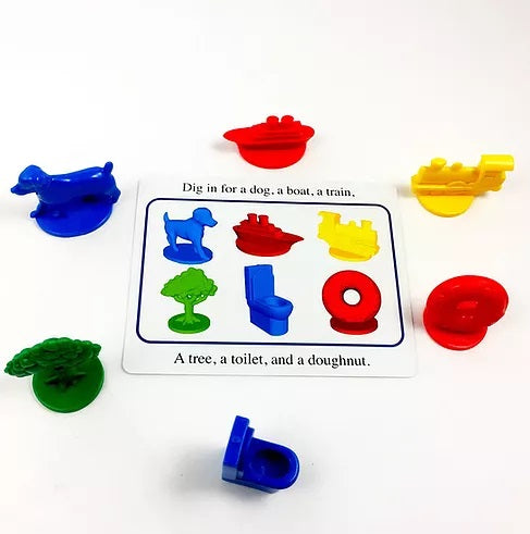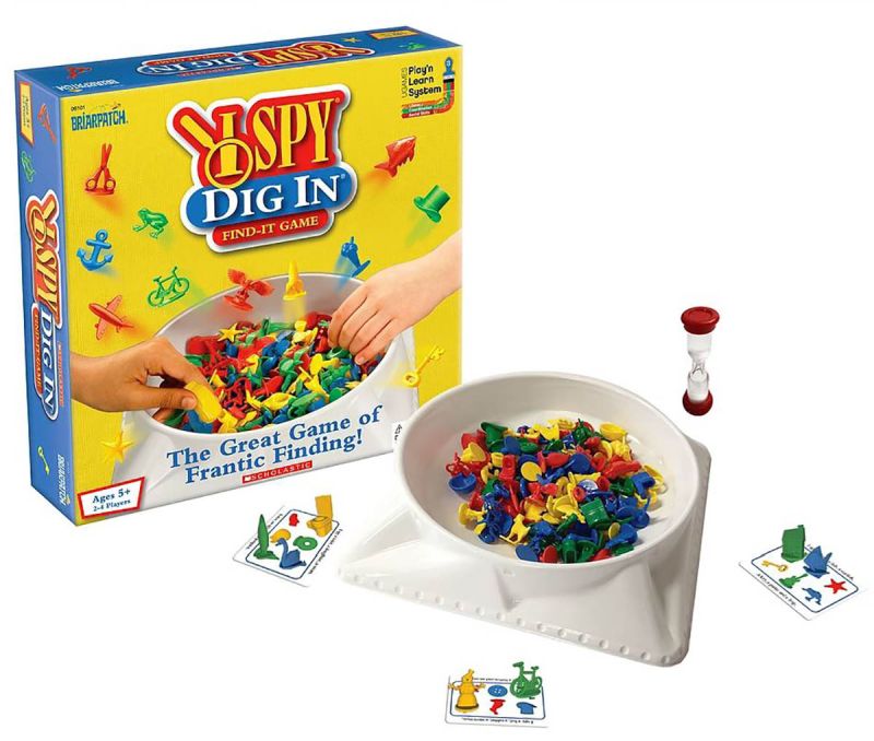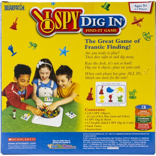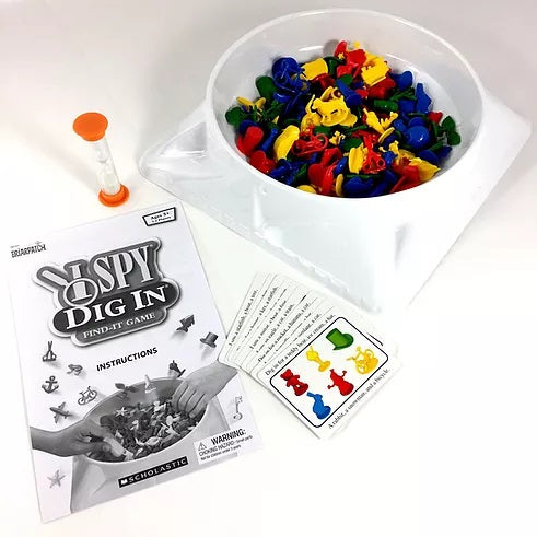 ¿Estás listo para jugar? Luego sumérgete y excava. ¡Corre contra el reloj, no es tan difícil! Excava 6 objetos, colócalos en tu tarjeta. Cuando cada jugador se haya ido TODO, ¡empareja uno más para ganar! I SPY Dig In es el gran juego de búsqueda frenética. Los niños practican la alfabetización, la coordinación y las habilidades sociales mientras corren para hacer coincidir las imágenes de sus tarjetas con los objetos del cuenco.