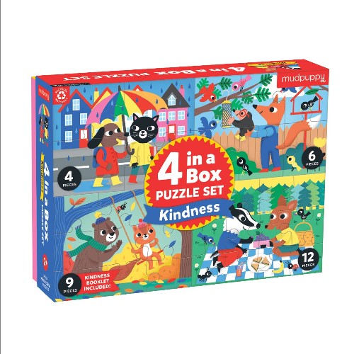 El juego de rompecabezas Kindness 4-in-a-Box de Mudpuppy incluye 4 rompecabezas, cada uno con un nivel de dificultad diferente. Los rompecabezas de 4, 6, 9 y 12 piezas revelan escenas ilustradas a color con animales adorables que demuestran actos de bondad.