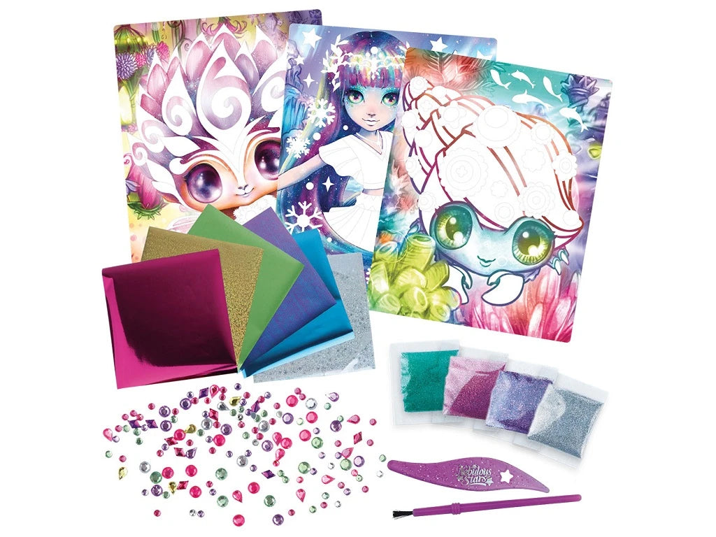Kit creativo para crear imágenes brillantes con papel de aluminio, purpurina y cristales.