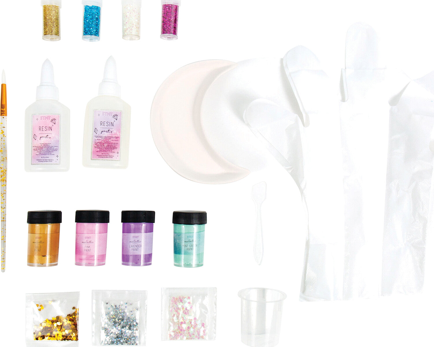 EL SET INCLUYE: 2 botellas de resina líquida (30 ml cada una), 1 plato de cerámica con forma de luna (12,8 x 9,3 cm), 4 botes de pintura metálica (rosa, verde menta, morado y dorado) de 15 ml cada uno, 1 pincel, 3 bolsas de confeti (2 en forma de corazón y 1 en forma de estrella), 4 agitadores de purpurina (1 dorado, 1 iridiscente, 1 morado y 1 verde azulado), 1 par de guantes protectores, 1 taza medidora, 1 espátula e instrucciones fáciles de seguir.
